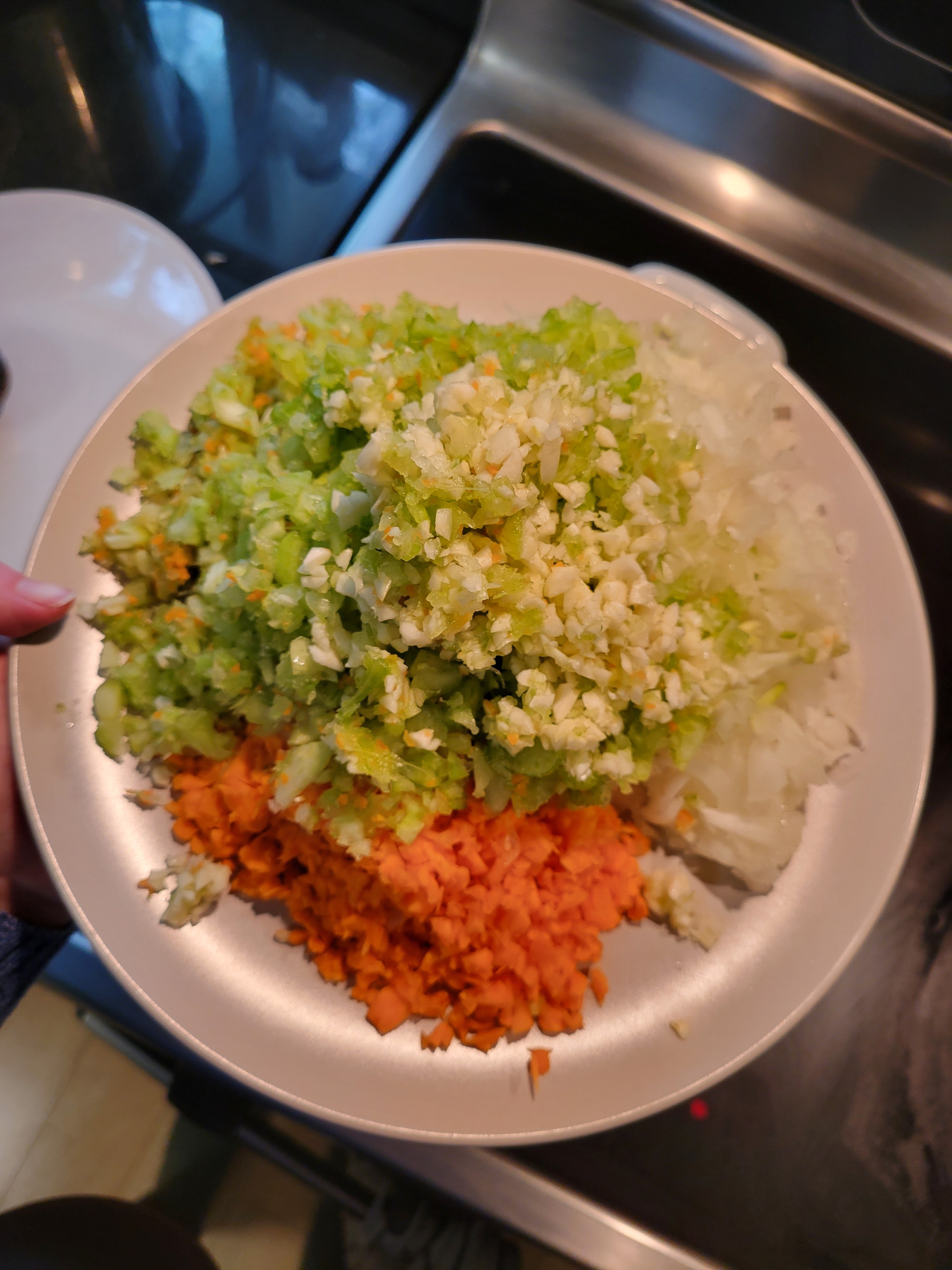 - I started by slapchopping my veggies (celery, carrots, onions, garlic) into a fine chop. This can also be done by chopping with a knife and cutting board, but my mum got me a slapchop and it is so much faster lol