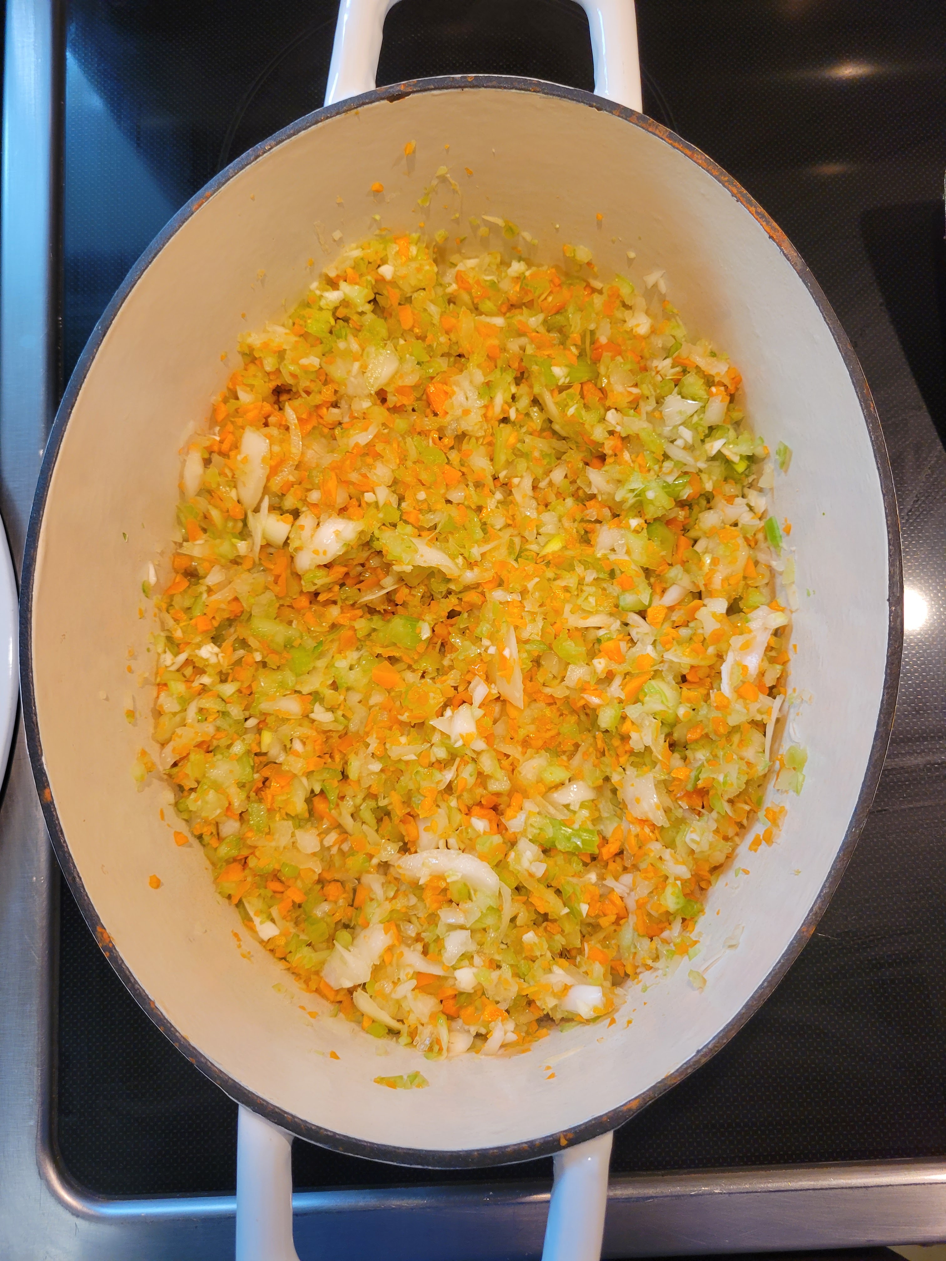 2. Then I sautéd the chopped veg with the olive oil over medium-low heat while I deboned the rotisserie chicken. If you deboned the chicken prior to starting, you would let this cook for about 10 minutes stirring occasionally.