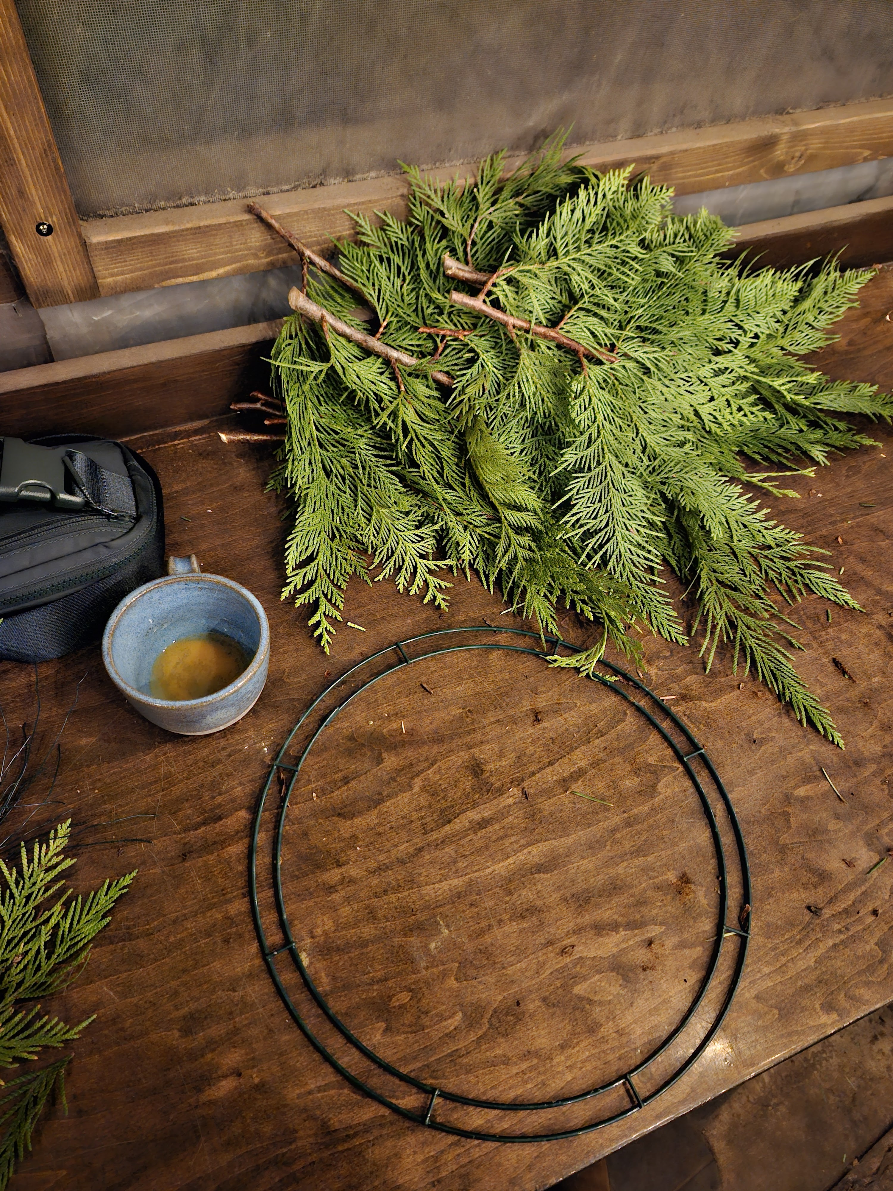 We all had a metal wreath frame, wire, and she gave us the different branches one type at a time to cut up and bunch to our liking.