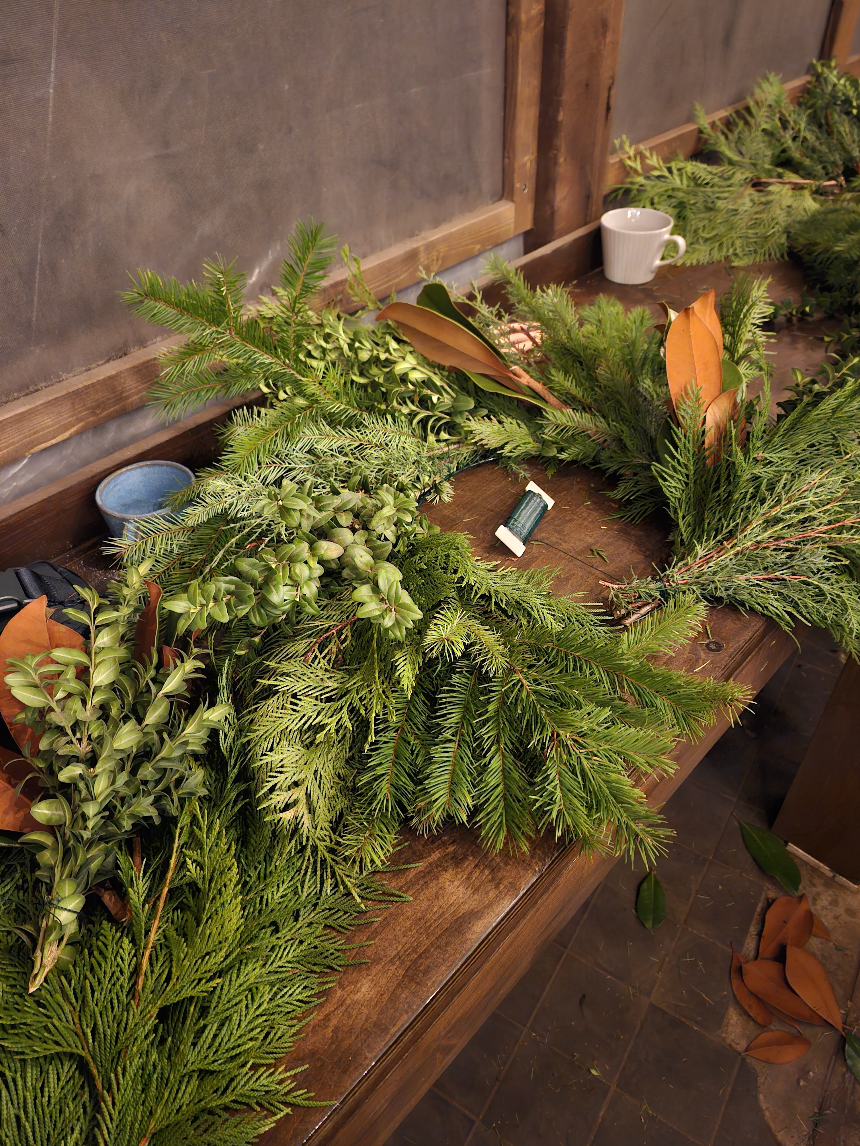 I don’t remember all of the types of branches she had for us but the ones I do remember are: boxwood, cedar, magnolia, Douglas fir, and a lemon-y scented one that I can’t remember!